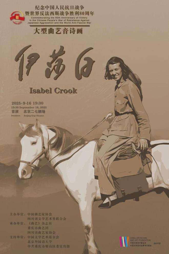 9月16日晚,由中国曲艺家协会、四川省文学艺术界联合会主办的原创大型曲艺音诗画《伊莎白》在京首演。作品以多曲种融合为主要表现方式,以交响乐和视觉艺术为辅助手段,讲述国际共产主义战士、中华人民共和国“友谊勋章”获得者伊莎白・柯鲁克的传奇人生,再现她跨越百年的中国情缘与崇高的国际主义情怀。