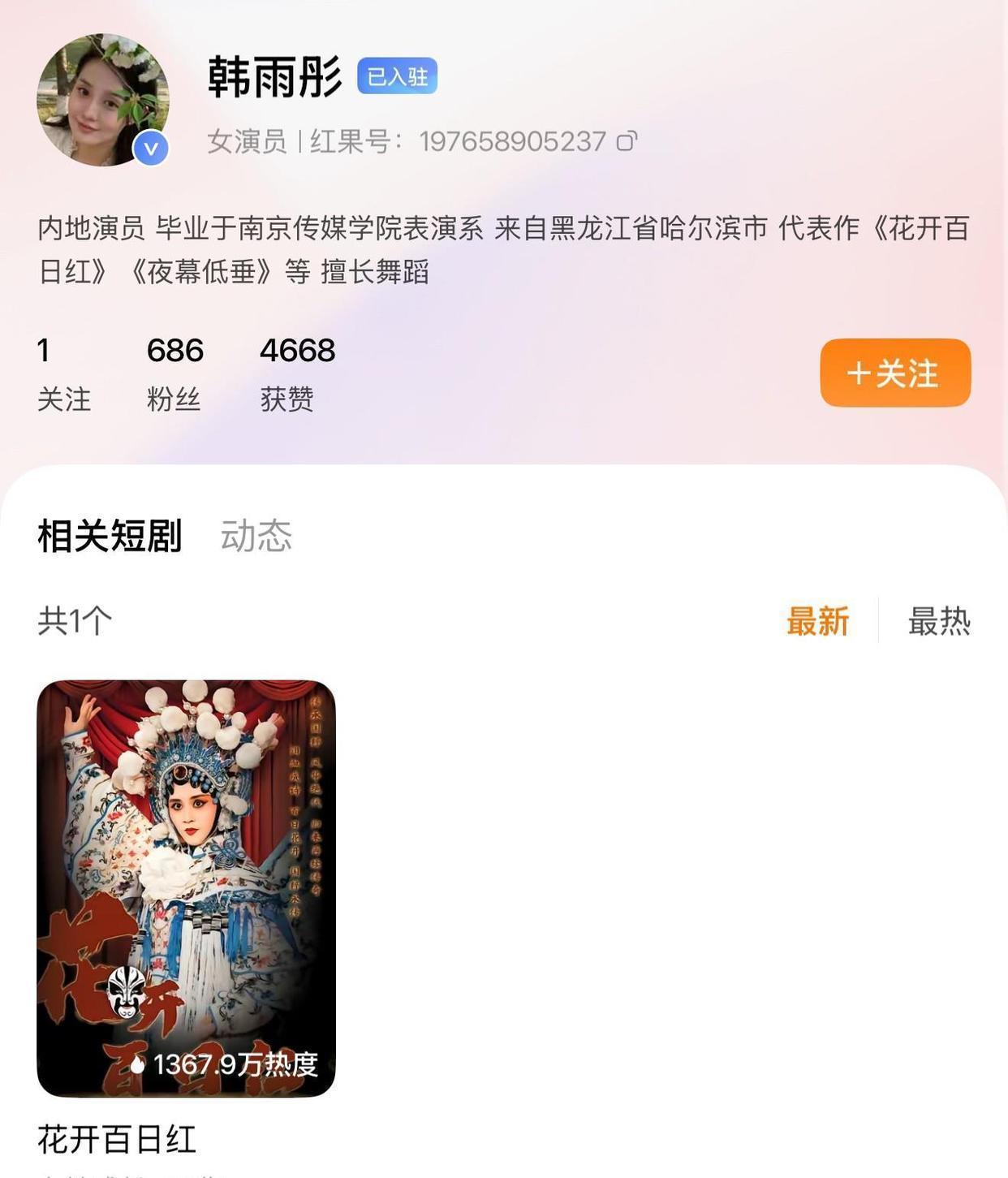 这位新人叫韩雨彤,正经科班出身,毕业于南京传媒学院表演系。二月份,她凭借《花开百日红》里的“尚筱柔”这个角色正式进入短剧圈,本来起步挺顺利的,却因为一个名字惹出了无妄之灾。